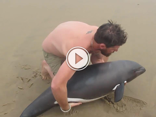 Man rescues baby dolphin who is stranded on the beach (Video)