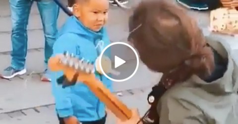 Guitarist working hard to get that kid’s smile (Video)