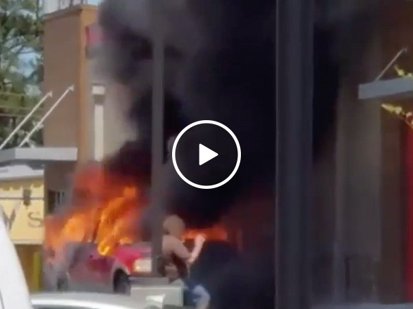 Standing next to a burning car, what could go wrong!? (Video)