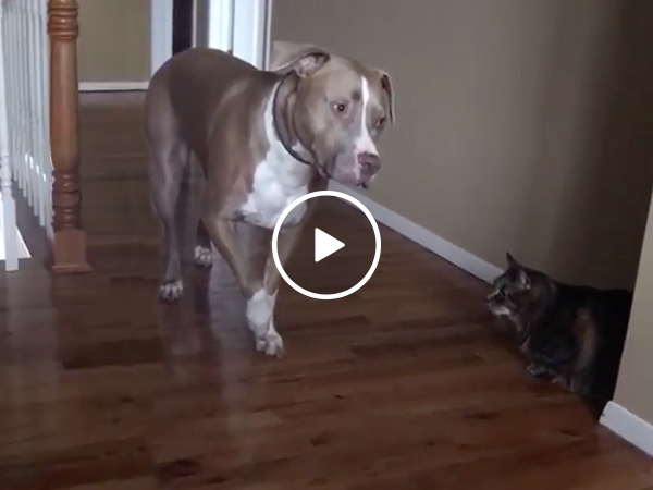 The cat’s got this pit bull frozen in fear (Video)