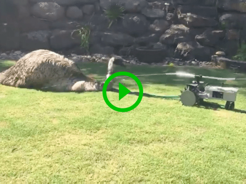 Pet emu beats the heat by chilling in front of a sprinkler (Video)
