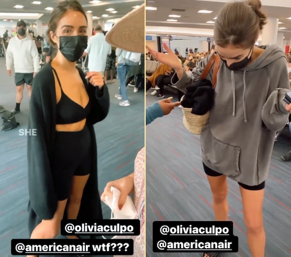 While on her way to Cabo San Lucas with her sister, an American Airlines employee suggested that her outfit wasn’t in line with the company’s dress code. She was wearing a black bralette, biker shorts and an oversized black cardigan but was made to put a sweatshirt on over it.
