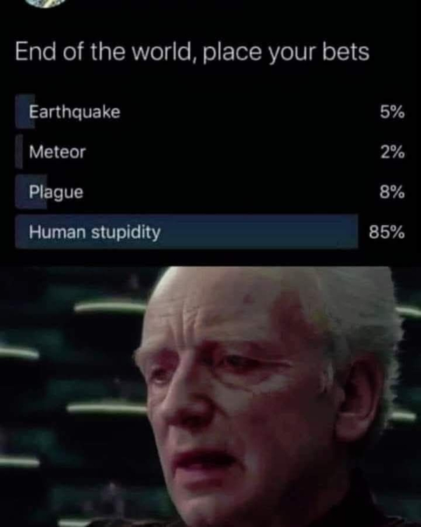 It’s been a joke since the dawn of time that human stupidity will end our species and not some giant space rock or disease. It will be us. And our stupidity.