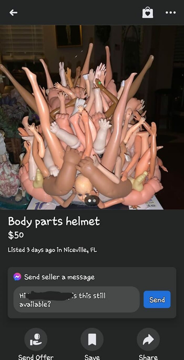 452 Liked! 10 Disliked 0 Insane online marketplace listings that actually, somehow, exist (30 Photos) by: Adam In: Funny, Shocking, WTF Jan 1, 2023 452 Liked! 10 Disliked 0 1 What have we here? Some things no one could possibly ever need, for any reason, whatsoever? Sure, I’ll take a look. Like this post? 452 Liked! 10 Disliked 0