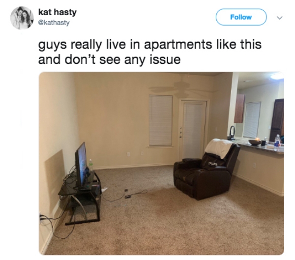 5 Liked! 1 Disliked 0 One man’s empty apartment has sparked an internet debate (13 Photos) by: Elizabeth In: Bachelor Pads, Captions, Funny, Genius or Stupid Dec 17, 2018 5 Liked! 1 Disliked 0 1 I can’t count how many guys I’ve known with an apartment exactly like this one. Men and women could both relate to the photo, but their reactions were quite different, with many (mostly women) making fun of it. Like this post? 5 Liked! 1 Disliked 0