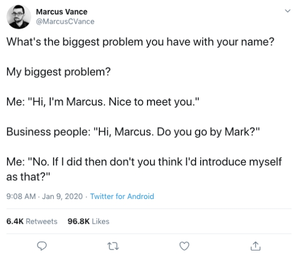 So, I absolutely identify with this Tweet from writer Marcus Vance, who then asked if other people have dealt with annoyances around their name. And whether it’s an uncommon name or dealing with frustrating abbreviations, a LOT of people responded to his Tweet.