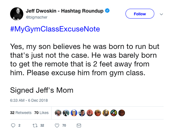 For me, gym was the only class that I knew I was guaranteed to pass, and probably the one that I skipped least (Except when I had Mr. D’Amico… Fuck you D’Amico, you’re still a dick!), so maybe I can’t really relate to the #MyGymClassExcuseNote hashtag too much, but I can laugh at it though.