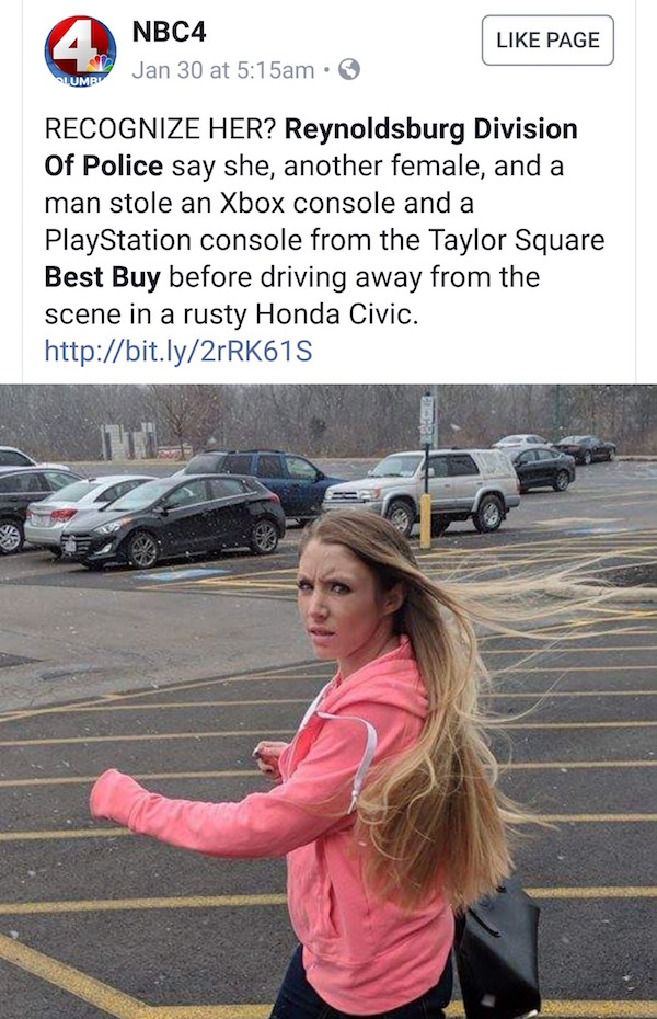 An Ohio woman is feeling the bitter wrath of social media after Reynoldsburg Police Department shared her photo via their Facebook page and accused her of stealing both a brand new XBox and PlayStation from a local Best Buy.