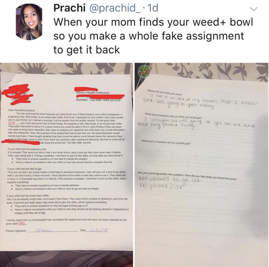 Teenagers will be teenagers, and whatever your thoughts are on weed use, the fact is that no minor is legally able to use the drug. So when one girl’s secret stash was unearthed by her concerned mother, the daughter had to quickly go to great lengths to cover her tracks and absolve herself of any wrongdoing. I’m not condoning the girl’s actions, but I am certainly giving her a standing ovation for how cleverly she came up with a fib that might just have saved her from being grounded for the next month+.