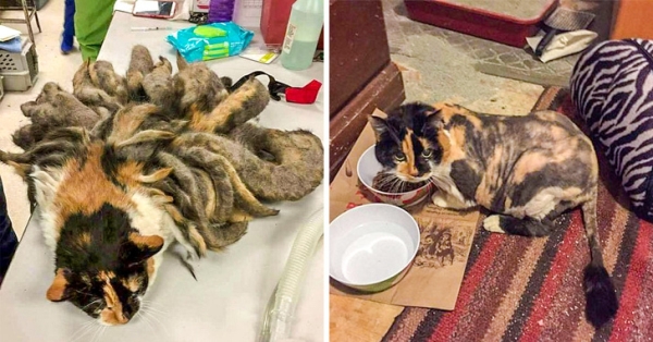 This poor cat survived for years after being abandoned by its owner who suffered from Alzheimer’s disease. She was struggling to move because of her severely matted fur, but one trip to the groomer’s and she is one happy cat ready to be adopted!