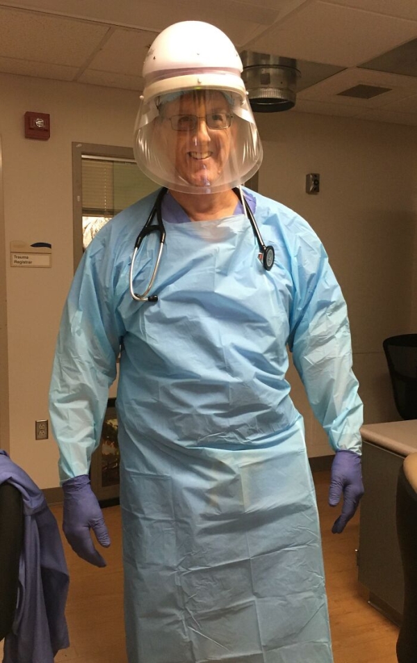 My 62-year-old father, who has been a doctor for 30+ years and is severely immunocompromised due to past lung damages, about to start his shift at the COVID unit of his hospital which he volunteered for. He never thinks about himself, only the patients
