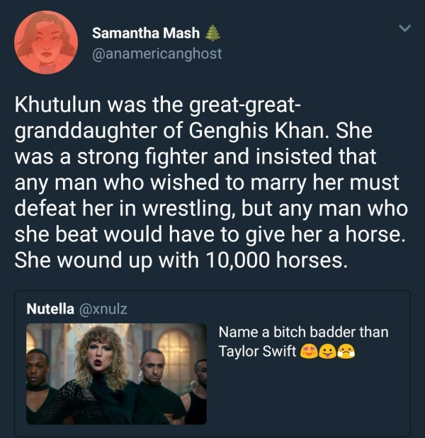 When someone tweeted “Name a bitch badder than Taylor Swift,” the internet was quick to do just that, rattling off all kinds of incredible women from throughout history.