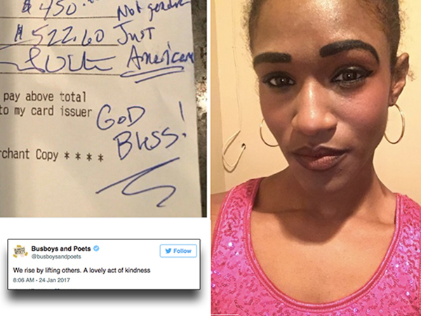 In a world full of dark news and polarizing politics, finally, there comes an uplifting story that we could all take to heart! But let me step back for a moment to set the scene. A black 25-year-old waitress named Rosalynd Harris was serving a table of cowboy hat-wearing Texans. Now looks can be deceiving and though all of us would like to admit that stereotypes don’t exist, a bunch of cowboy-looking guys can put even the calmest server on edge. I mean, I’ve seen Tombstone, so clearly I have a grasp of cowboy culture — I jest, of course. Thankfully, the men were not only salt of the earth gentlemen but after the meal was over they left a massive $450 tip on a $72 bill — that’s 625 percent in case you’re wondering. But the good news didn’t end there…