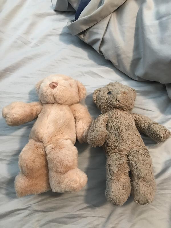 Same teddy bear, 30 years apart. One is mine, other is my newborn son’s.