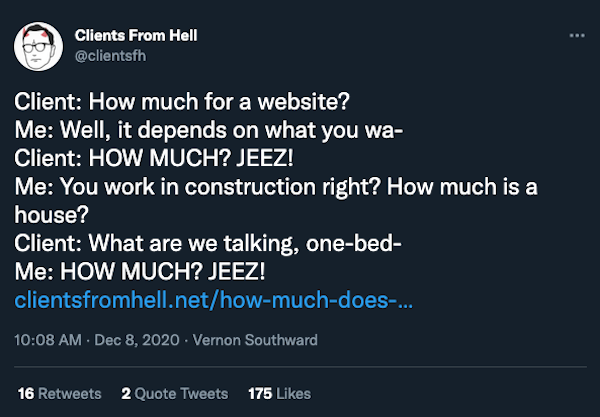 You can get an idea of their pain from this fantastic Twitter page, Clients From Hell. Freelancers have been anonymously submitting their most ridiculous clients, and the end results are hilarious (and grim).