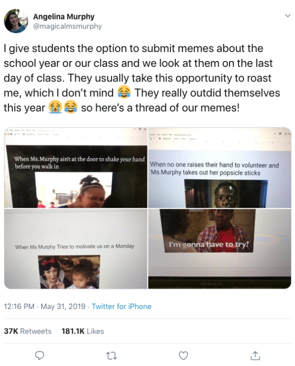 All of these come from the students of Angelina Murphy, a high school teacher who offers extra credit for memes. While a few of these memes are definitely very specific to Ms. Murphy’s class, many of them feel painfully familiar. The end result is a teacher getting roasted, but as you can see, she’s completely okay with that. Everyone wins!