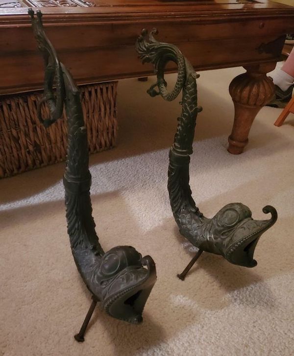 A: They’re andirons or sometimes called fire dogs. They are used for storing logs for the fireplace and are often quite valuable.