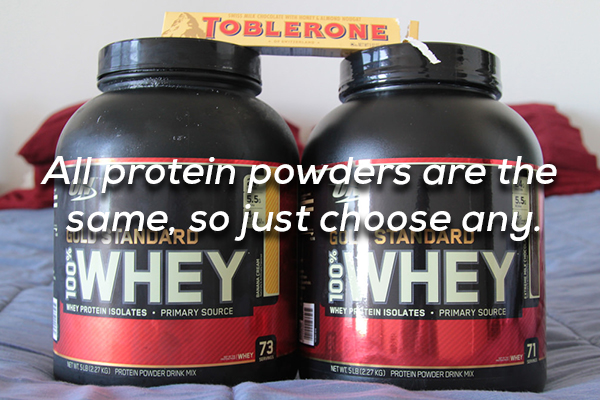 You’ll often hear that for the most part, protein powders are all the same and that the only real difference comes from price and flavour. Truth be told, there are quite a few different kinds of protein (whey, casein, soy, etc) and they all work a little bit differently. There are also big differences in sugar, cholesterol, and fat levels in different brands. Find one that best suits your needs.