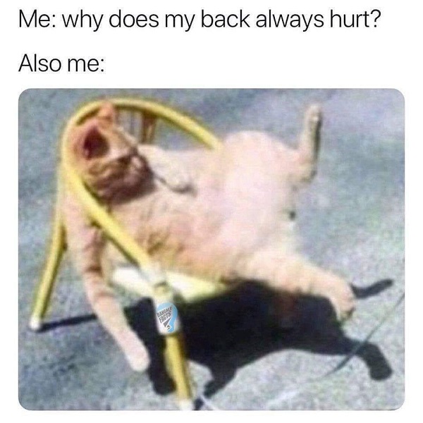 How many of you can relate to this meme? I know I can- especially when I spend a lot of my day hunched over typing away into a laptop. Over the years, you start to develop positional habits that are so common-place for you that you don’t even really notice it. This isn’t always a good thing, so let’s take a look at common positions people often find themselves in that could be doing a number on your body.
