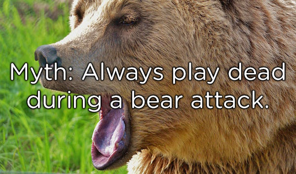 Fact: If you’re in the wilderness and see a bear, the best advice is to quietly back away. If it’s in your yard or campsite, make yourself as big and loud as you can and try to scare it off. In the case of an attack, your response depends on the bear. Never play dead if a black bear attacks. In the event of brown/grizzly, first attempt to back away, then play dead.