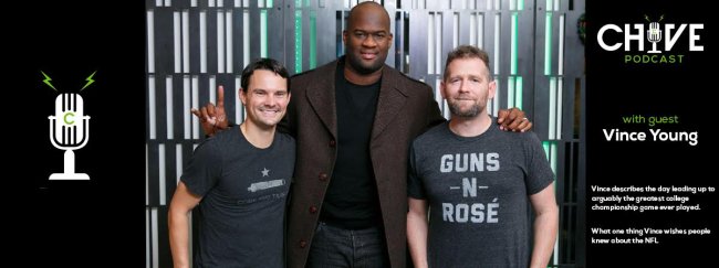 Texas Longhorn for life, Vince Young, took time away from his regular rockstar-like status here in Austin to join us for a spirited chat at theCHIVE HQ. The former NFL QB, turned entrepreneur, and now mentor to less privileged children here in town, has lived several lifetimes in his short 33 years. Vince has survived everything from broken homes, to broken bones, and ultimately learned how to successfully break into the ‘real world’ after his NFL career ended. He has managed this transition with class, and even when he’s made mistakes he’s never once run away from the truth or denied an ounce of responsibility publicly. But few have seen the fun & animated side of Vince that John & I have been fortunate enough to know over our last few encounters together. Yes, for some reason Vince keeps coming back to check in on us — go figure.
